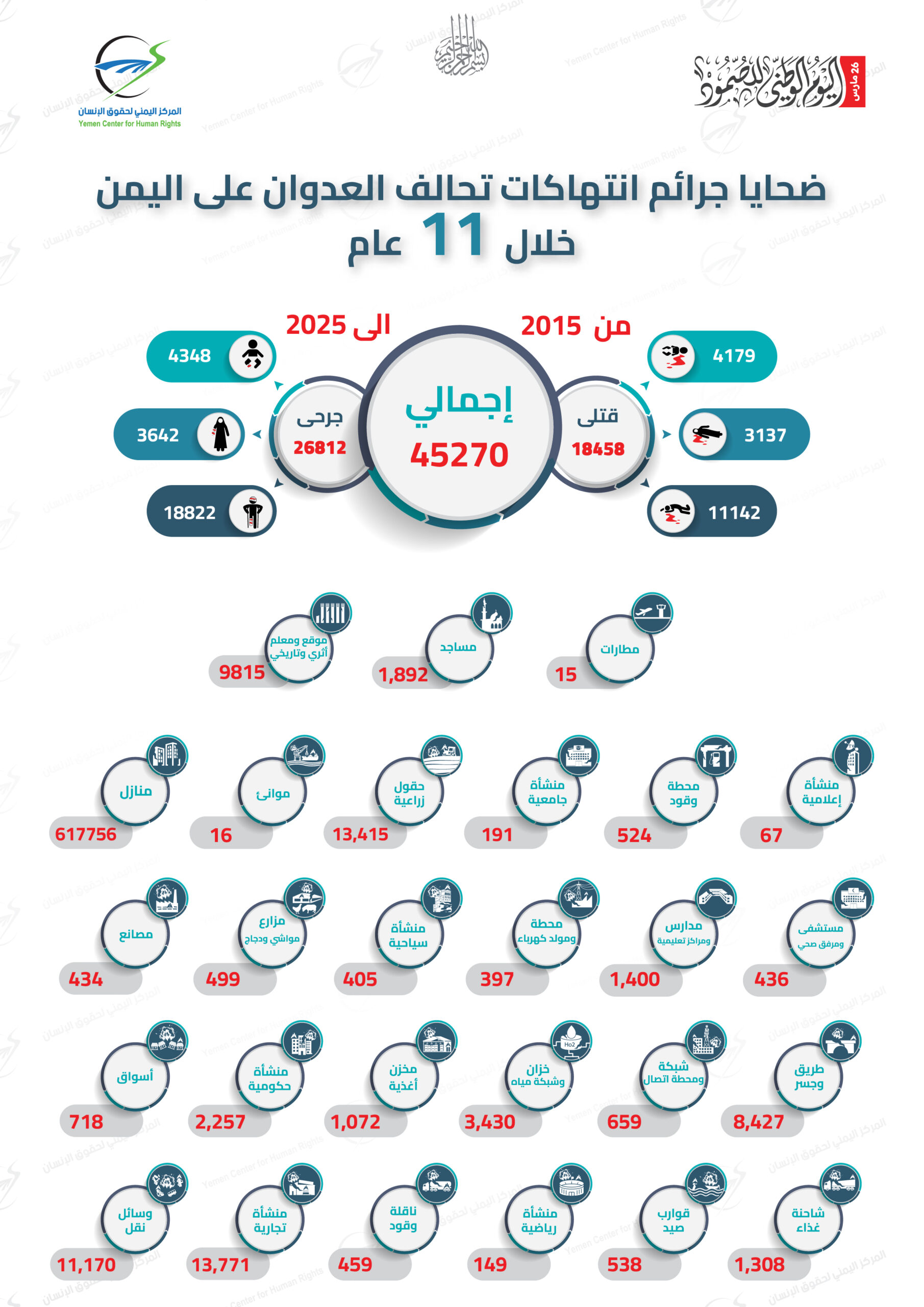 في 26 مارس 2015 وبعد أولى الغارات الجوية على حي سكني في العاصمة صنعاء، أعلنت السعودية من واشنطن عن تحالف عدواني لأكثر من 21 دولة على رأسها السعودية، الإمارات، البحرين، السودان، أمريكا، إسرائيل، بريطانيا، ودول أخرى. غارات افتتاحية تلاها مئات آلاف الضربات الجوية والبرية والبحرية التي نفذتها هذه الدول ضد الدولة اليمنية وشعبها دون سابق إنذار طوال الفترة الماضية، كان من نتائجه سقوط (45,270) مدنياً منهم (18,458) قتيلاً و(26,812) جريحاً حسب الإحصائية التي استطاع المركز توثيقها. بينما الاحصائيات الرسمية الصادرة عن وزارة العدل وحقوق الإنسان تشير إلى أن عدد الضحايا بلغ (59346) مدنياً منهم (24126) قتيلاً و(35220) جريحاً.