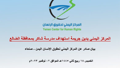 يدين المركز اليمني لحقوق الإنسان ما قامت به الجماعات المسلحة التابعة لدول تحالف العدوان باستهدافها مدرسة شاكر المرح بمنطقة حمام…